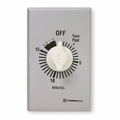 Spring-Wound Timer Timing Range 0 to 15 min Contact Form SPST HP @ 120V 1 hp HP @ 240V 2 hp Max Amps @ 125VAC 20 A Max Amps @ 250VAC 10 A Max Amps @ 277VAC 10 A Number of Gangs 1 Hold Feature Yes Faceplate Color Silver Knob Plastic Standards CSA Certified (LR3730) UL Listed (E76987)