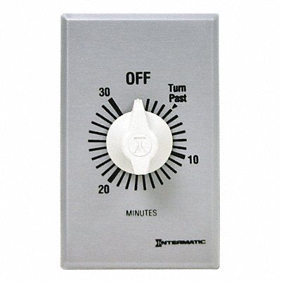 Spring-Wound Timer Timing Range 0 to 30 min Contact Form SPST HP @ 120V 1 hp HP @ 240V 2 hp Max Amps @ 125VAC 20 A Max Amps @ 250VAC 10 A Max Amps @ 277VAC 10 A Number of Gangs 1 Hold Feature No Faceplate Color Silver Knob Plastic