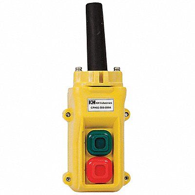 Pendant Push Button Station Legend User Configurable Contact Form 1NO/1NC Mechanical Interlock No NEMA Rating 4X Housing Color Yellow Hub 19/64 in to 13/32 in Action Momentary Number of Operators 2 Type of Operator Push Button Number of Speeds 1 Contact Rating 0.4A @ 120V DC 2A @ 24V DC 5A @ 125/240V AC Height 5.2 in Width 3.1 in Depth 1.5 in Housing Material ABS Standards UL/cUL Listed Includes Cable Bushing(s)