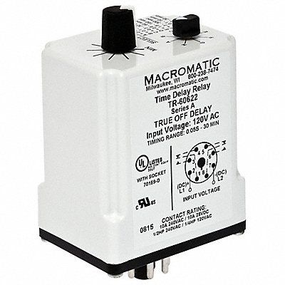 H7840 Single Function Time Delay Relay Adjustment Method Rotary Switch Base Shape Octal Coil Voltage 120V AC/DC Contact Form DPDT Contact Rating (AC) 10 A @ 240V Contact Rating (DC) 8 A @ 28V Current Rating 10 A Number of Delay Functions 1 Delay Function Off Delay Electrical Connection Socket Flat Pin Width Not Applicable IP Rating IP20 Input Voltage 240V AC Minimum Time Setting 0.05 sec Maximum Time Setting 30 min Number of Pins 8 Sealing Enclosed Mounting Style Plug-In