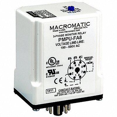 Phase Monitor Relay Base Shape Octal Contact Form SPDT Contact Rating (AC) 10 A @ 277V Contact Rating (DC) 7 A @ 30V Current Rating 10 A Input Voltage 190 to 500V AC Monitored Parameters Overvoltage Phase Loss Phase Reversal Phase Unbalance Undervoltage Number of Pins 8 Restart Auto Manual Restart Time Delay 2 sec Mounting Style Plug-In Body Depth 2.9 in Body Height 2.4 in Body Width 1.7 in Electrical Operating Durability 100 000 For Use With Sensors Frequency 50/60 Hz
