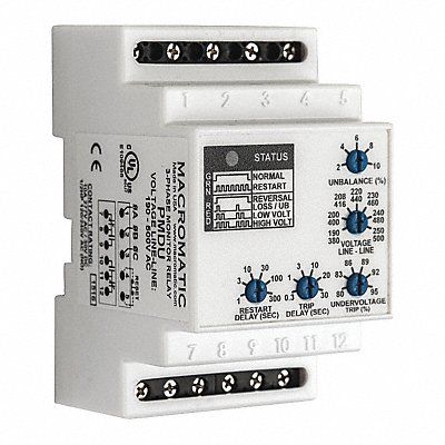 Phase Monitor Relay Contact Form DPDT Contact Rating (AC) 10 A @ 277V Contact Rating (DC) 10 A @ 30V Current Rating 10 A Input Voltage 480 to 600V AC Monitored Parameters Overvoltage Phase Loss Phase Reversal Phase Unbalance Undervoltage Number of Pins 12 Restart Auto Manual Restart Time Delay 1 to 300 sec Mounting Style DIN Rail Body Depth 2.4 in Body Height 3.5 in Body Width 2.1 in Electrical Operating Durability 100 000 For Use With Sensors Frequency 50/60 Hz