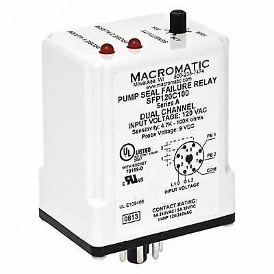 Pump Seal Failure Relay Contact Form SPST-NO Current Rating 5 A Electrical Connection 8-Pin Terminal Input Voltage 120V AC Number of Channels Dual Channel Number of Pins 8 Relay Function Seal Leakage Seal Leak Minimum Resistance 4 700 ohm Seal Leak Maximum Resistance 100 000 ohm Status Indicator LED Indicator Contact Rating (AC) 5 A @ 240V Contact Rating (DC) 5 A @ 28V Mounting Style Plug-In Adjustment Method Rotary Knob Base Shape Octal Body Depth 2.9 in Body Height 2.33 in