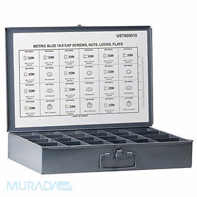 Hex Head Cap Screw Assortment Metal Box Container Material Metal Steel Blue Phosphate Flat Washers Included (50) M6 Hex Nuts Included Hex Nuts (25) M6-1 (25) M8-1.25 (25) M10-1.5 Lock Washers Included (25) M10 (50) M6 (50) M8 Screws/Bolts Included Hex Head Cap Screws (25) M6-1x20 mm 25) M6-1x25 mm 25) M6-1x30 mm 25) M6-1x35 mm (10) M6-1x40 mm (10) M8-1.25x20 mm (10) M10-1.5x20 mm (5) M8-1.25x40 mm (5) M10-1.5x40 mm Hex Material Grade/Class Class 10.9 Number of Sizes 24