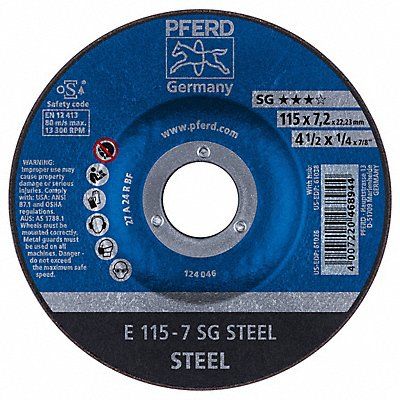 Depressed Center Wheels Abrasive Wheel Type Type 27 Abrasive Wheel Diameter 4 1/2 in Thickness 1/4 in Arbor Hole Size 7/8 in Abrasive Material Aluminum Oxide Abrasive Grit 24 Max RPM 13 300 Series SG Grade Very Coarse Application Ferrous Metal