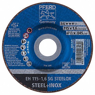 Depressed Center Wheels Abrasive Wheel Type Type 27 Abrasive Wheel Diameter 4 1/2 in Thickness 0.045 in Arbor Hole Size 7/8 in Abrasive Material Aluminum Oxide Abrasive Grit 46 Max RPM 13 300 Series SG-INOX Grade Coarse Application Ferrous Metal and Stainless Steel