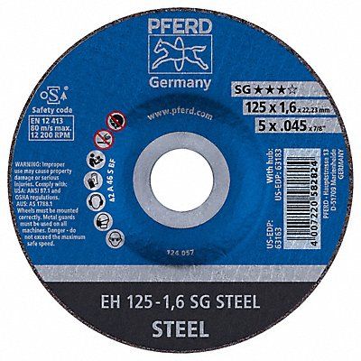Depressed Center Wheels Abrasive Wheel Type Type 27 Abrasive Wheel Diameter 5 in Thickness 0.045 in Arbor Hole Size 7/8 in Abrasive Material Aluminum Oxide Abrasive Grit 30 Max RPM 12 200 Series SG Grade Extra Coarse Application Ferrous Metal