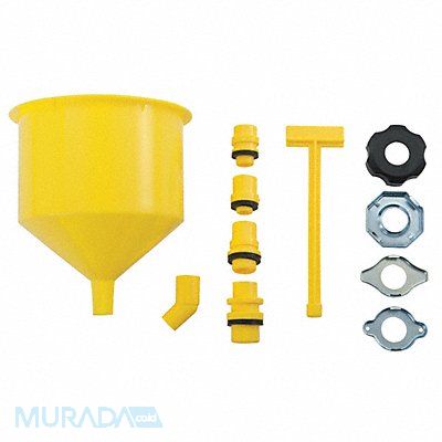 Spill Free Funnel Set Material ABS Fluid Capacity 64 fl oz Overall Diameter 6 in Overall Height 6 11/16 in Spout Outside Diameter 1/2 in Spout Length 1 in Color Yellow Finish Smooth Includes (4) Adapters