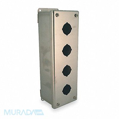Pushbutton Enclosure Number of Columns 1 Number of Holes 4 NEMA Rating 12 13 4 4X Conduit Size No Conduit Entrance Holes Provided Dimensions 10.25 in H x 3.25 in W x 2.81 in D Hole Size 30 mm Material 304 Stainless Steel Height 10.25 in Width 3.25 in Depth 2.81 in Color ANSI 61 Powder Paint Stainless Grained Includes Neoprene Gasket and Mounting Flange Type Oil Tight Standards cULus EGP-1-1967 JIC