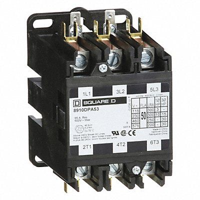H2643 Definite Purpose Magnetic Contactor Number of Poles 3 65 A Full Load Amps-Resistive 50 A Full Load Amps-Inductive Coil Volts 208/240V AC HP @ 1 Phase - 120V 3 hp HP @ 1 Phase - 240V 10 hp HP @ 3 Phase - 240V 15 hp HP @ 3 Phase - 480V 30 hp HP @ 3 Phase - 575V 30 hp Height 4.06 in Width 2.56 in Depth 3.67 in Enclosure NEMA Rating No Enclosure Hz 50/60 Reversing No Series Standard Includes Quick Connect Terminal Standards CE CSA UL