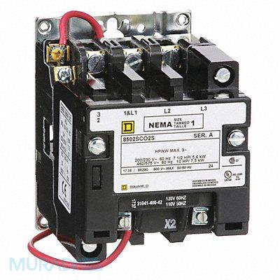 NEMA Magnetic Contactor Full Load Amps 27 A Coil Volts 120V AC NEMA Contactor Size 1 Reversing No HP @ 3 Phase - 208V 7 1/2 hp HP @ 3 Phase - 240V 7 1/2 hp HP @ 3 Phase - 480V 10 hp HP @ 3 Phase - 575V 10 hp Number of Poles 3 Enclosure NEMA Rating No Enclosure Hz 50/60 Height 4.34 in Width 3.22 in Depth 4.22 in Frame / Series / Class / Code Class 8502 Standards CSA UL