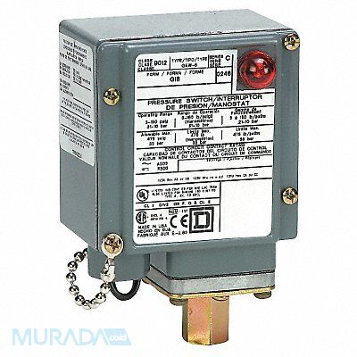 Pressure Switch Differential 59 to 200 psi Range 20 to 1000 psi Port Type 1-Port 1/4-18 in FNPT Contact Form SPDT NEMA Rating 13 4 4X Actuation Type Piston Action Standard Series 9012G AC Contact Rating 10A @ 480V DC Contact Rating 0.11A @ 250V 0.22A @ 125V