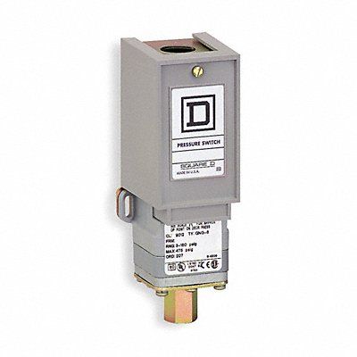 Pressure Switch Differential 200 to 950 psi Range 170 to 5600 psi Port Type 1-Port 1/4-18 in FNPT Contact Form SPDT NEMA Rating 1 Actuation Type Piston Action Standard Series 9012G Ambient Temp Range -10 Degrees to 185 Degrees F Media Temp Range -40 Degrees to 250 Degrees F AC Contact Rating 10A @ 480V DC Contact Rating 0.11A @ 250V 0.22A @ 125V