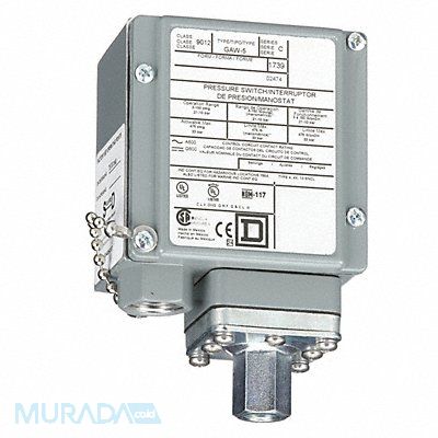 Pressure Switch Differential 6 to 30 psi Range 3 to 150 psi Port Type 1-Port 1/4-18 in FNPT Contact Form SPDT NEMA Rating 13 4 4X Actuation Type Diaphragm Action Standard Series 9012G AC Contact Rating 10A @ 480V DC Contact Rating 0.11A @ 250V 0.22A @ 125V