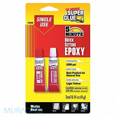 Epoxy Adhesive Container Type Tube Coverage Dependent On Substrate Cure Method Ambient Cured Color Yellow Features Fast-Setting For Use With Dispensing Tube and Mixing Stick Included Components Resin and Hardener Interior/Exterior Interior/Exterior Low Odor No Marine Grade No Materials Bonded Ceramic Metal Wood VOC Content Weight 0 g/L VOC Content Weight Percentage 0 Percent Water Resistance Water-Resistant Working Time 5 min Maximum Application Temperature 120 Degrees F