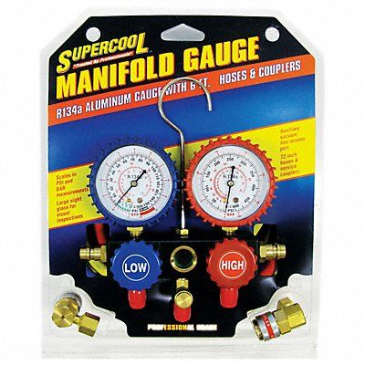 A/C Manifold Gauge Tool Type A/C Manifold Gauge Set Application Automotive A/C Material Aluminum Brass Steel For Use With R-134A A/C System Overall Diameter 13 in Overall Length 10 in Overall Width 5 in Number of Pieces 5 Includes 72 in Red - Yellow - Blue Hoses Quick Connect Couplers