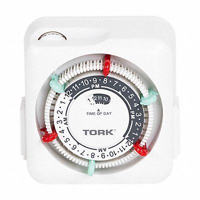 Heavy Dutry Appliance Timer Mechanical Min Time Setting 30 min Max Time Setting 24 hr Voltage 120V AC Watts 1 800 W Amps 15 A HP @ 120V 1/2 hp Type of Switch Manual Indoor Receptacles 2 Color White Style Plug In Features Manual On/Off Override Switch Two Grounded Outlets Two Sets of On/Off Trippers Standards cULus