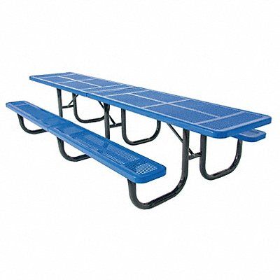 ADA Shelter Table Rectangle Entry Walk Through Tabletop Material Perforated Metal Overall Width 144 in Overall Depth 70 in Overall Height 30 in Bench Height 18 in Color Blue Frame Color Black Frame Finish Powder Coated Frame Material Steel Top Thickness 2 in Weight Capacity 1800 lb Required