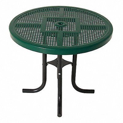 Picnic Table Perforated Shape Round Height 30 in Bench Height 18 in Diameter 36 in Frame Color Black Top Thickness 2 in Surface Material Steel Top Frame Material Powdercoated Steel Weight Capacity 50 lb Assembly Required Color Green