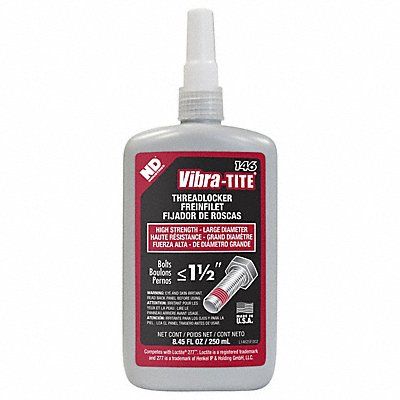 High-Strength Threadlocker For Material Type Brass Bronze Copper Iron Manganese Monel Nickel Steel Threadlocking Strength High Color Red Series 146 Container Size 8.45 fl oz Container Type Bottle For Maximum Thread Diameter 1 1/2 in Working Time 9 min Breakaway Torque 300 in-lb Cure Type Anaerobic Compatible Primer Series Loctite 7649 Standards ASTM D-5363 MIL-S-46163-A Chemical Base Dimethacrylate Compatible Primer (Grainger Part Number) 4KL11 Flash Point 268 Degrees F