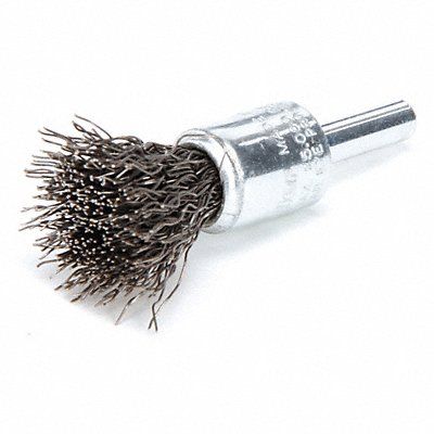 End Brush End Brush Bristle Type Crimped Wire Brush Dia 1/2 in Abrasive Shank Size 1/4 in Wire Dia 0.014 in Bristle Trim Length 7/8 in Abrasive Material Carbon Steel Max RPM 25 000 RPM Overall Length 2 1/2 in