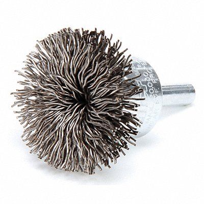 End Brush End Brush Bristle Type Crimped Wire Brush Dia 1 1/2 in Abrasive Shank Size 1/4 in Wire Dia 0.02 in Bristle Trim Length 7/8 in Abrasive Material Carbon Steel Max RPM 22 000 RPM Overall Length 3 in